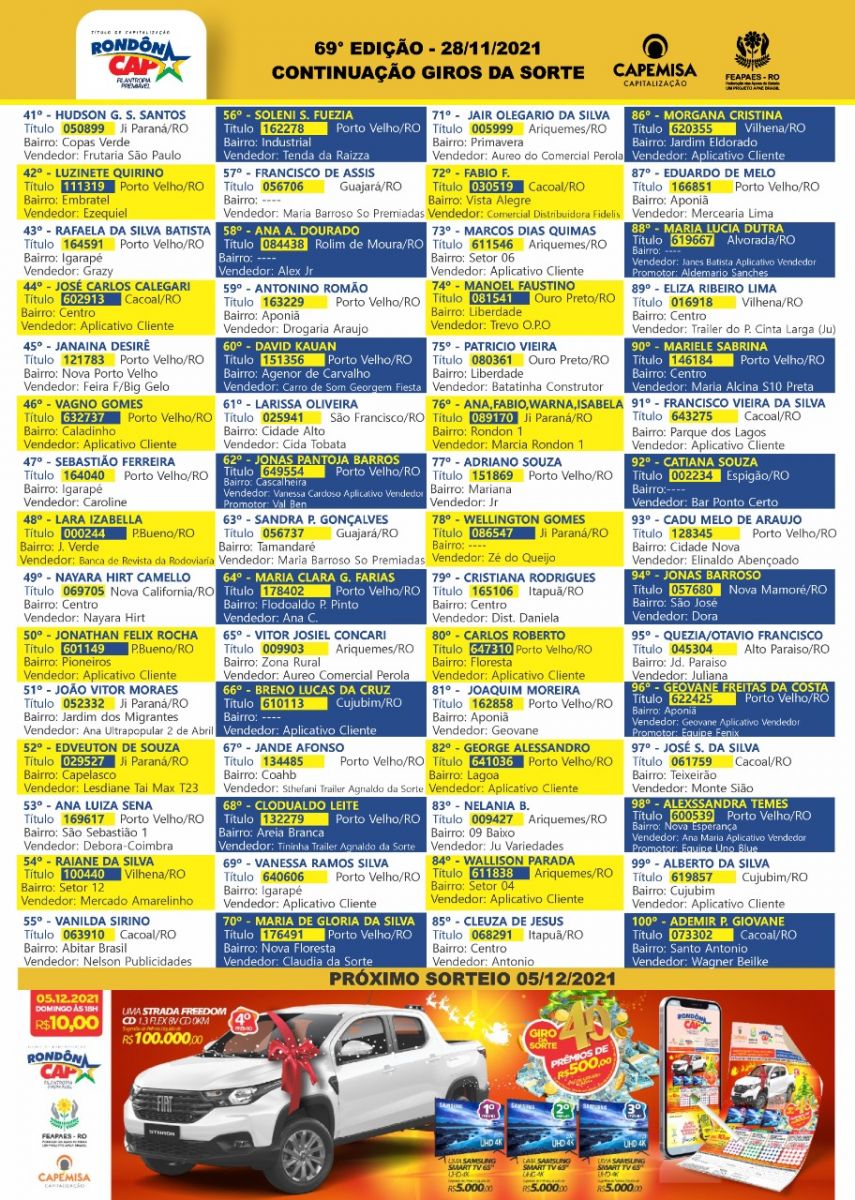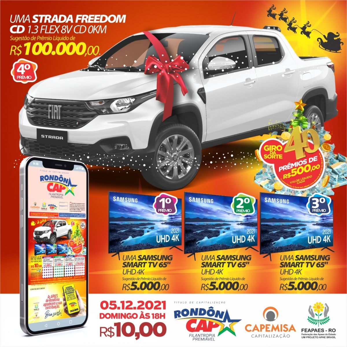 A picape mais vendida do Brasil pode ser sua no Rondoncap deste domingo (5) e o título só 10 reais. No quarto prêmio tem uma Fiat Strada cabine dupla no valor de 100.000 reais. É a nova Strada na garagem ou 100.000 reais na conta bancária, quem ganhar vai escolher e pode ser você! e ainda tem mais 3 Smart-Tvs de 65 polegadas no valor de 5.000 reais cada e 40 giros da sorte! São muitos prêmios.