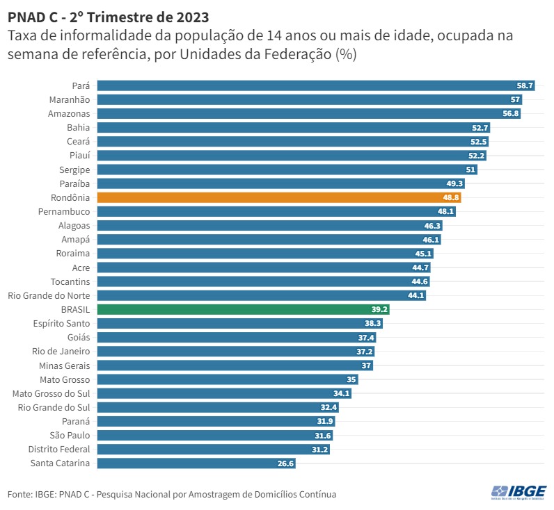 No geral, Santa Catarina (26,6%), Distrito Federal (31,2%), São Paulo (31,6%), Paraná (31,9%) e Rio Grande do Sul (32,4%) apresentam as menores taxas de informalidade. Já as maiores estão no Pará (58,7%), Maranhão (57%), Amazonas (56,8%), Bahia (52,7%), Ceará (52,5%) e Piauí (52,2%).