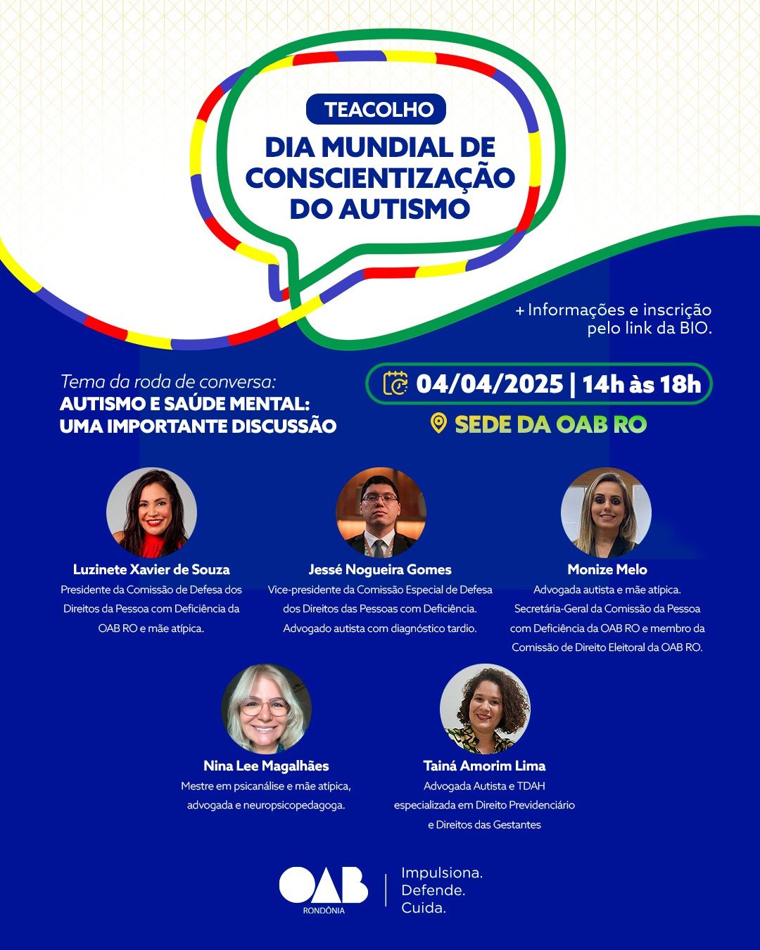 OAB Rondônia, por meio da Comissão de Defesa dos Direitos da Pessoa com Deficiência, promove o evento TEACOLHO, uma oportunidade para discutir direitos, desafios e avanços na inclusão e acessibilidade da comunidade autista. O evento contará com palestra sobre saúde mental, roda de conversa com advogados autistas e serviços como massagem relaxante, maquiagem, sorteios de brindes e coffee break.