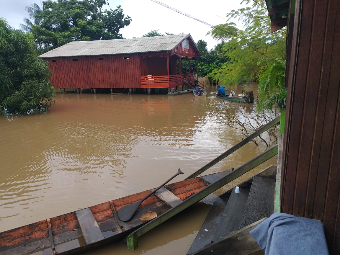 A situação no distrito de Nazaré, localizado no Baixo Madeira, em Porto Velho, continua grave devido à cheia do rio Madeira. Nesta segunda-feira (07), moradores da comunidade enviaram imagens que mostram a região completamente alagada. A água já ocupa toda a área na margem onde o rio Aponiã desagua no Madeira, cobrindo ruas, passarelas e até estabelecimentos comerciais.
