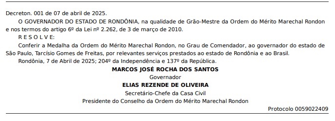O governador de Rondônia, Marcos Rocha (UB) concedeu a Tarcísio Freitas (REP), governador de São Paulo, a maior honraria do estado de Rondônia - a medalha da Ordem do Mérito Marechal Rondon, no grau de comendador. A justificativa do título, como publicado no Diário Oficial do Estado na última segunda-feira (7), são os ‘relevantes serviços prestados’ ao estado de Rondônia e ao Brasil.