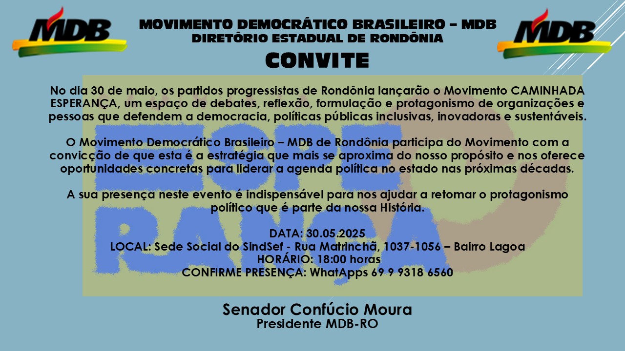 E o MDB está tentando mostrar que apesar de algumas baixas nos quadros da legenda, não está abalado. Tanto que no próximo dia 30 de maio, a partir das 18h, na sede do Sindsef, na rua Matrinchã, 1037, no bairro Lagoa, na capital, estará lançando o ‘Movimento Caminhada Esperança’. O objetivo é criar um espaço para se discutir democracia e políticas públicas. Debates super necessários ainda mais em tempos de extrema-direita atuando para desestabilizar a democracia e demais instituições!