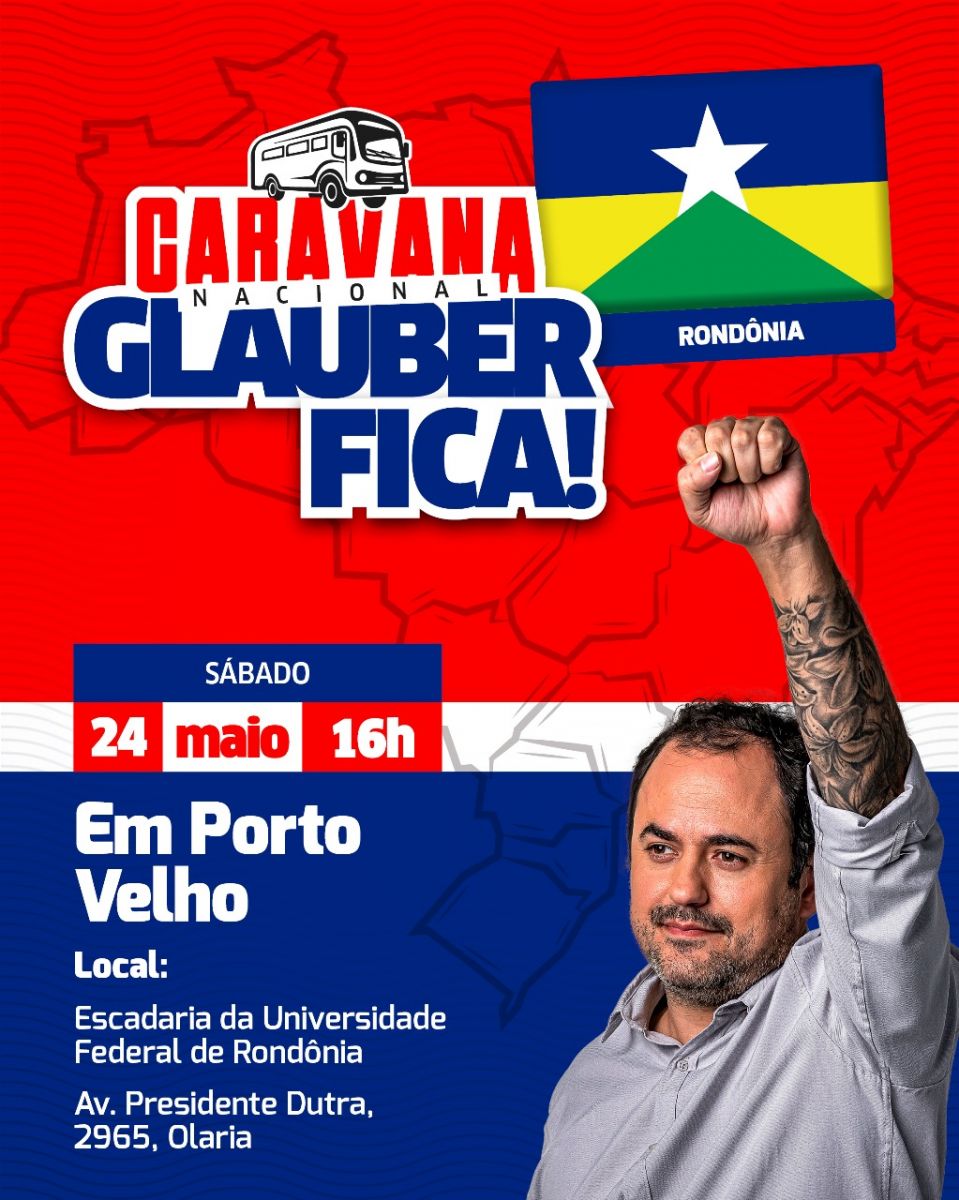 Quem estará passando por Porto Velho é o deputado Federal Glauber Braga(PSOL). Ele fica o sábado(24), na capital, onde fará um evento, às 16h, nas escadarias da Unir, no centro. A vinda é parte da ‘Caravana Nacional Glauber Fica’, que tem como objetivo denunciar o movimento no Congresso Nacional para a cassação do parlamentar.