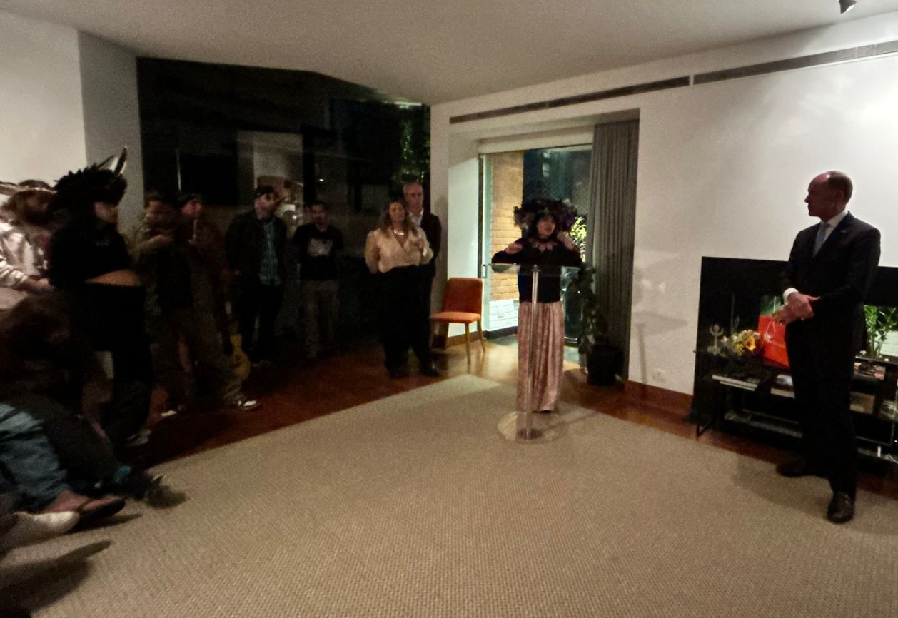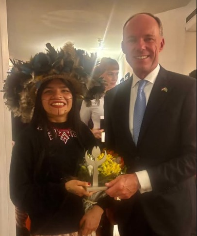 Na presença do coral Guarani, composto por crianças e adultos do Povo Guarani, Txaí recebeu a condecoração pela sua atuação na defesa do clima e dos direitos humanos. Emocionada, agradeceu à embaixada, aos familiares e amigos presentes, reconhecendo a participação de cada um em sua luta diária.