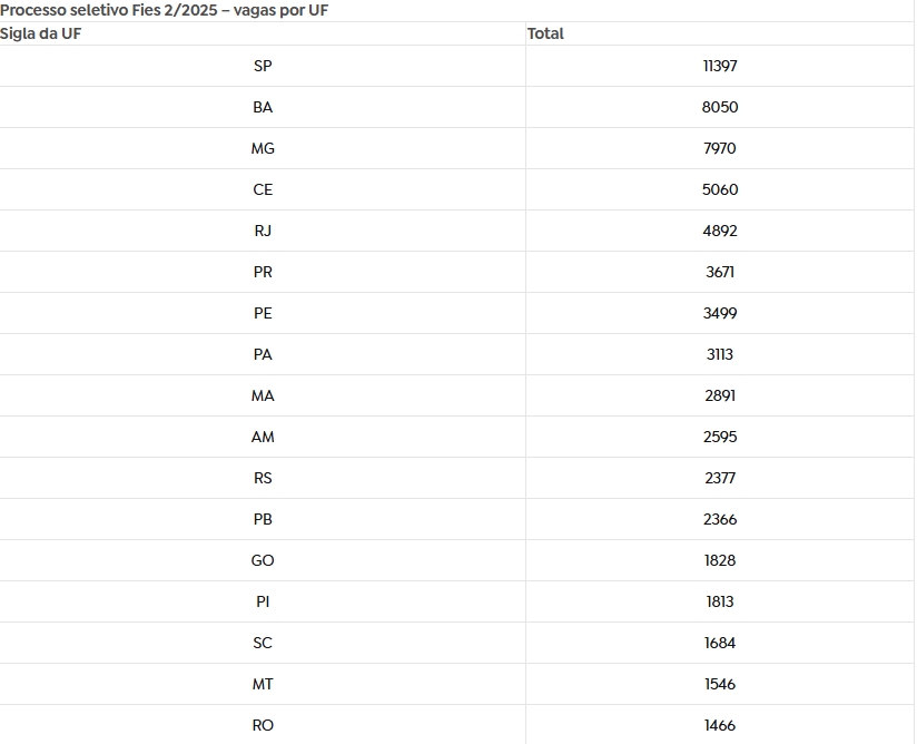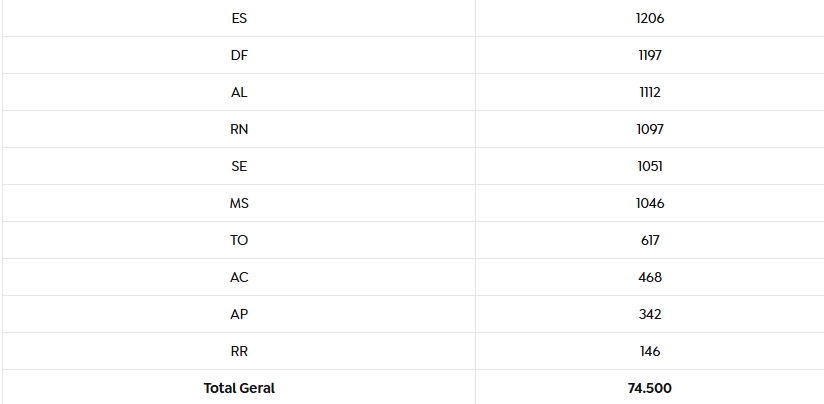 Veja abaixo a tabela de vagas por unidade da Federação: