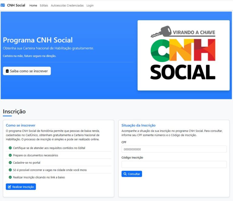 O Programa CNH Social, do governo de Rondônia, está na fase de análise e seleção dos inscritos, conforme os dados informados pelos candidatos e com base nos critérios estabelecidos em edital. São 1.500 vagas gratuitas para a primeira habilitação, disponibilizadas pelo Departamento Estadual de Trânsito (Detran-RO), nos 52 municípios do estado. Do total, 1.350 vagas são destinadas à ampla concorrência e 150 para pessoas com deficiência (PcD).