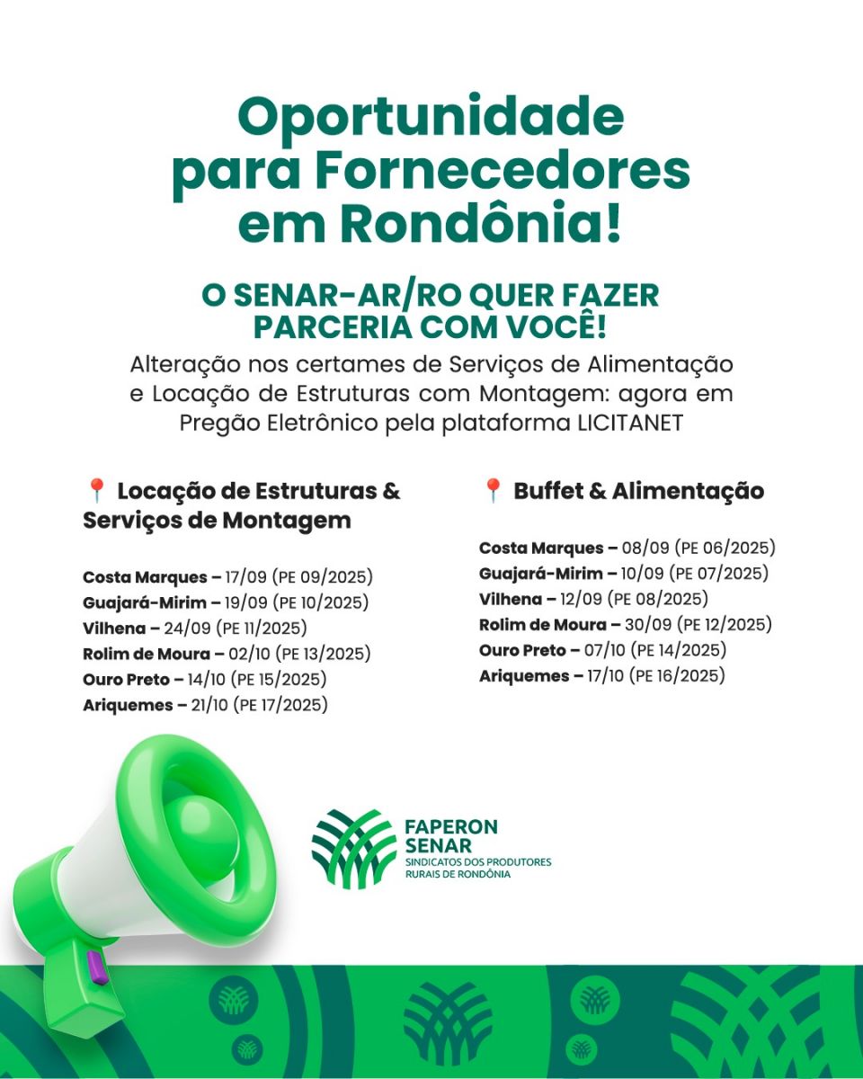 O Serviço Nacional de Aprendizagem Rural de Rondônia (SENAR-RO) lançou dois pregões eletrônicos voltados à contratação de empresas especializadas nos segmentos de locação de estruturas e serviços de montagem e buffet e alimentação. O objetivo é garantir suporte essencial para a realização de eventos institucionais em diferentes microrregiões do estado.