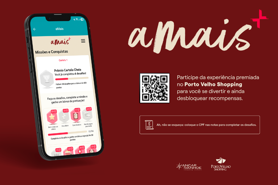 O Porto Velho Shopping apresenta no dia 1º de outubro, às 16h, o lançamento oficial do aMais, programa de benefícios que transforma cada visita ao shopping em oportunidades de ganhar prêmios e descontos. O acesso será feito direto pelo app do Porto Velho Shopping, onde os clientes recebem uma cartela mensal com 16 desafios.