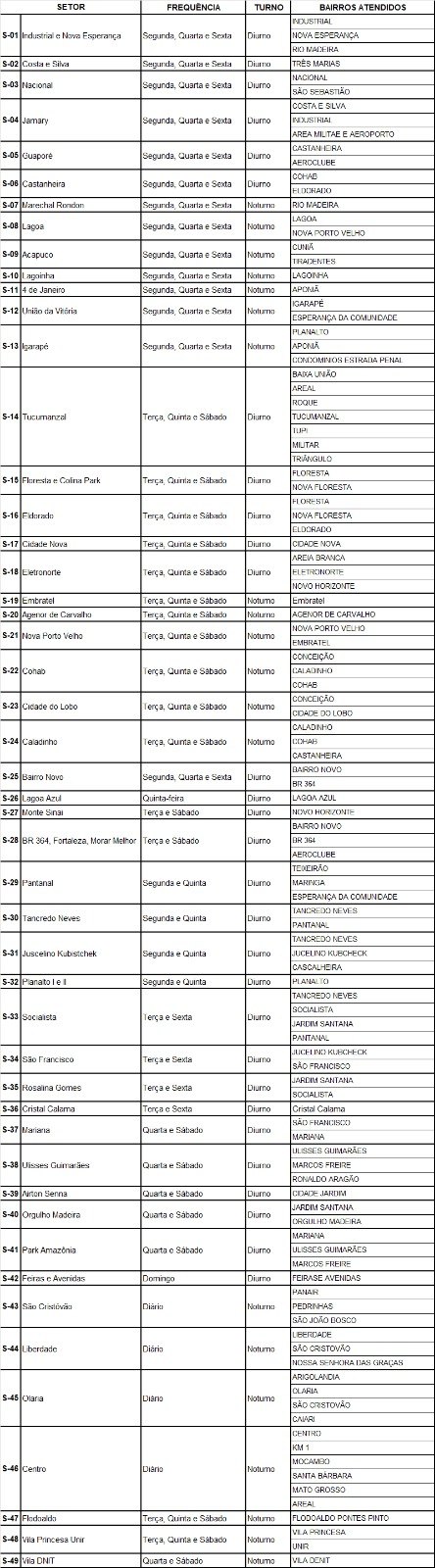 A coleta está organizada por setores operacionais, e cada setor engloba um ou mais bairros, sendo o nome citado apenas como referência principal (confira lista abaixo).