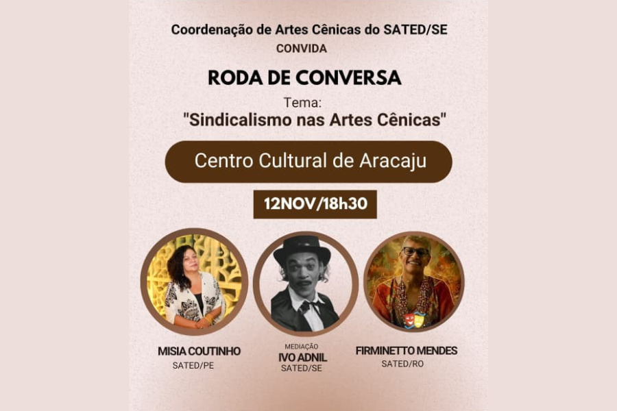 O encontro contará com a participação de Misia Coutinho, do SATED-PE, e Firminetto Mendes, do SATED-RO, com mediação de Ivo Adnil, do SATED-SE. que também é o organizador do evento. A proposta é promover o diálogo entre artistas, sindicalistas e trabalhadores das artes cênicas, abordando pautas como valorização profissional, direitos trabalhistas, representatividade e políticas culturais.