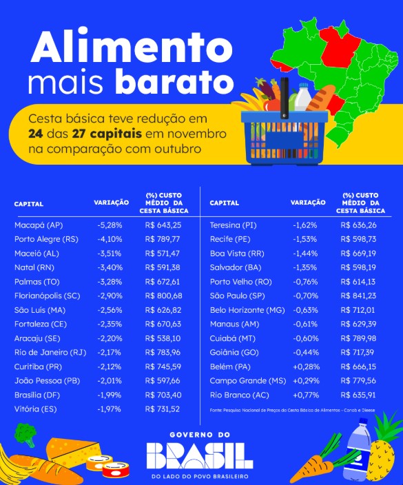 NACIONAL – Na avaliação nacional, em novembro, o valor dos alimentos básicos caiu, entre outubro e novembro, em 24 das 27 capitais onde a pesquisa é realizada, com destaque para Macapá (-5,28%), Porto Alegre (-4,10%), Maceió (-3,51%), Natal (-3,40%) e Palmas (-3,28%). No acumulado no ano, entre dezembro de 2024 e outubro de 2025, nove capitais registram queda no preço da cesta básica, com destaque para Brasília (-5,35%), Natal (-4,20%) e Aracaju (-2,88%).