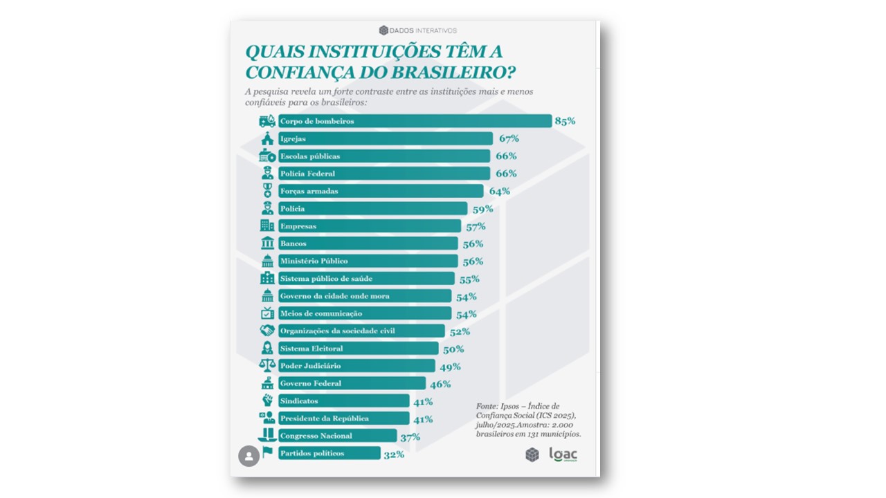 Dados do Índice de Confiança Social (ICS 2025) evidenciam um contraste marcante na percepção dos brasileiros sobre as instituições do país. Enquanto órgãos ligados ao serviço direto à população concentram os maiores índices de credibilidade, as instituições políticas seguem entre as menos confiáveis, revelando um distanciamento persistente entre sociedade e representantes.
