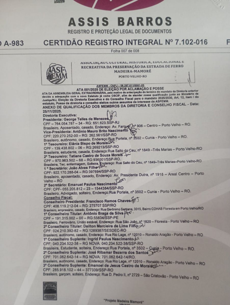 Ao final do evento, foi apresentada a diretoria eleita e empossada, que passa a conduzir os trabalhos da Asfemm com o compromisso de fortalecer as ações em defesa da Estrada de Ferro Madeira-Mamoré e de sua relevância para a história regional.