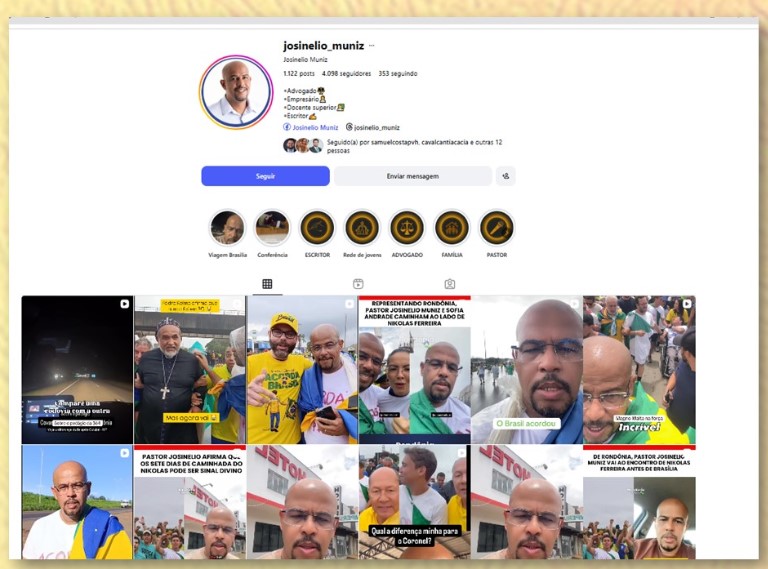 Josinélio Muniz é um conhecido pastor evangélico de extrema direita da cidade de Porto Velho (RO), e também exerce a função de Assessor Especial na Prefeitura da capital e abandonou seu posto de trabalho, sem qualquer justificativa formal, para se unir ao ato público promovido contra decisão do Poder Judiciário que culminou na condenação do ex-presidente Jair Bolsonaro (PL) a mais de 27 anos.