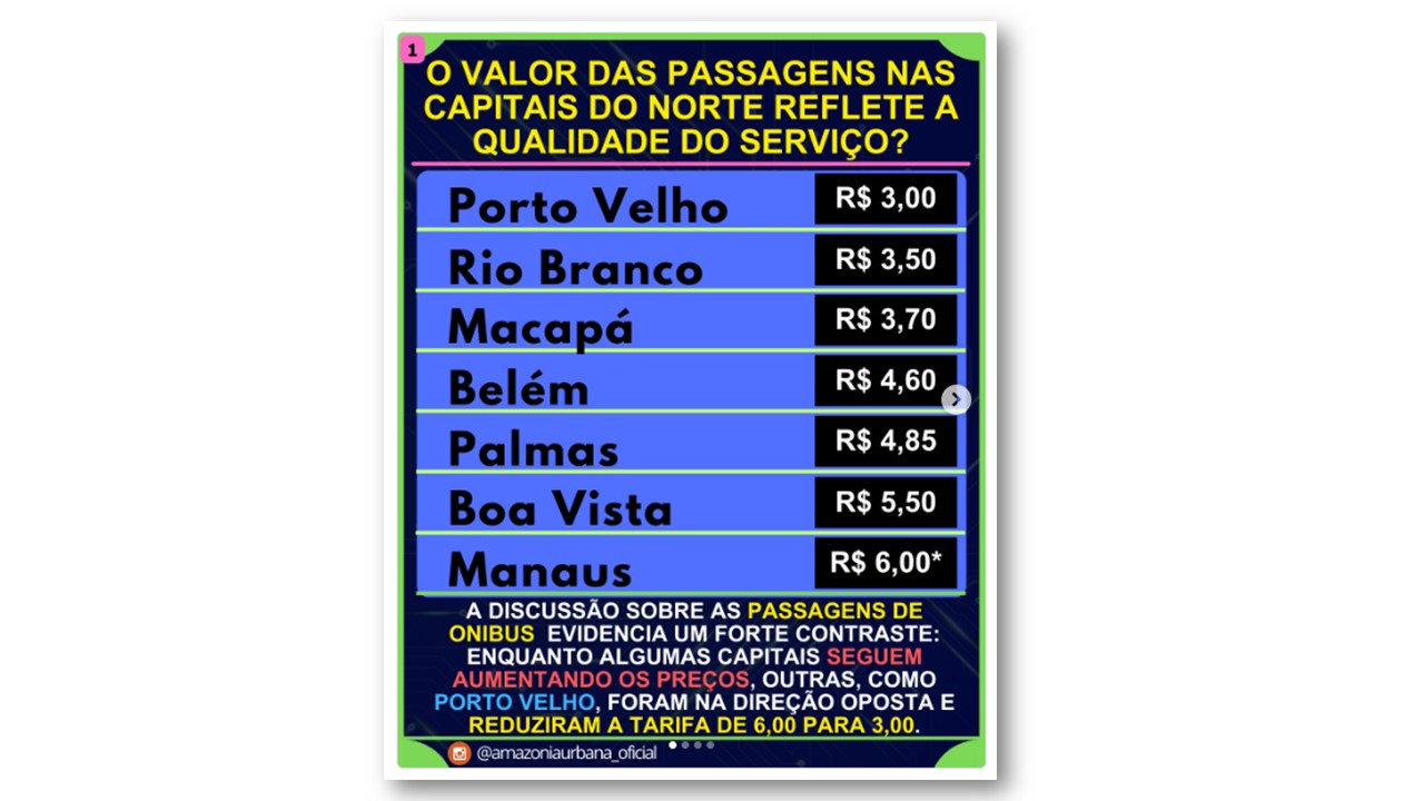 A mobilidade urbana nas capitais da Região Norte revela contrastes que vão além do valor da tarifa cobrada do usuário. Em Porto Velho, a redução da passagem de ônibus urbano de R$ 6,00 para R$ 3,00 colocou a capital de Rondônia entre as cidades com a tarifa mais baixa do país e, atualmente, a mais barata entre as capitais do Norte.