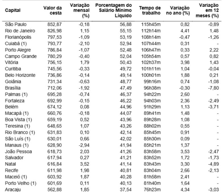 No cenário nacional, a pesquisa mensal do Dieese indicou que 14 capitais registraram aumento no valor da cesta básica de um mês para o outro. O maior custo médio entre as capitais brasileiras foi observado em São Paulo, onde a cesta básica chegou a R$ 852,87.