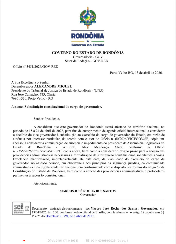 Segundo o Ofício nº 3451/2026, o vice-governador Sérgio Gonçalves (UB) comunicou a ausência "por interesse particular". Logo na sequência da linha de sucessão, o presidente da Assembleia Legislativa do Estado (ALE-RO), deputado Alex Redano (REP), também informou "ausência e impedimento" para assumir a chefia do Executivo.