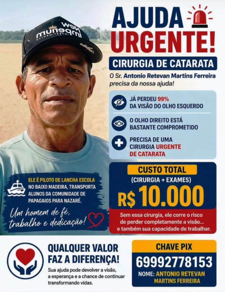 Há histórias que atravessam rios — e também o coração de uma comunidade inteira. A de Antônio Retevan Martins Ferreira é uma delas. Há anos, ele é o responsável por conduzir a lancha escolar que transporta estudantes da comunidade ribeirinha de Papagaios até Nazaré, no Baixo Madeira. Todos os dias, faça chuva ou sol. Agora, porém, é Antônio quem precisa de ajuda.