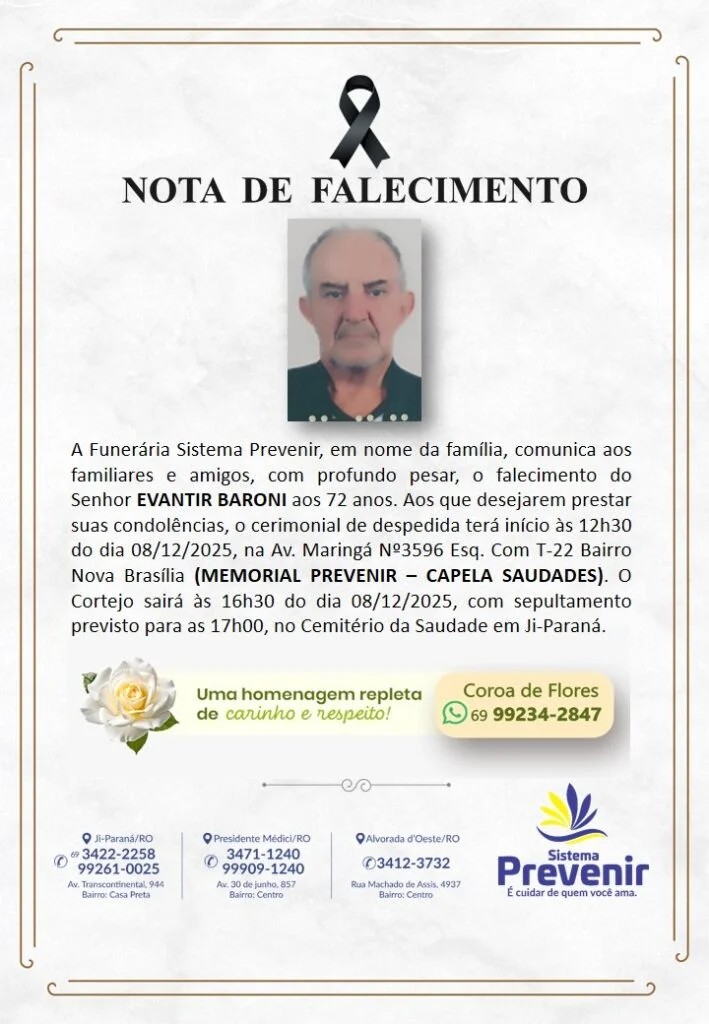 O velório deve ocorrer no memorial Previnir no 2° distrito de Ji-Paraná. Avenida Maringá com T22.