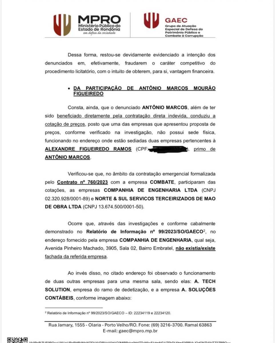 O caso segue em análise pelo Ministério Público e pelo Poder Judiciário, envolvendo apuração de possíveis irregularidades em licitação pública no município de Pimenteiras do Oeste, no Cone Sul de Rondônia.