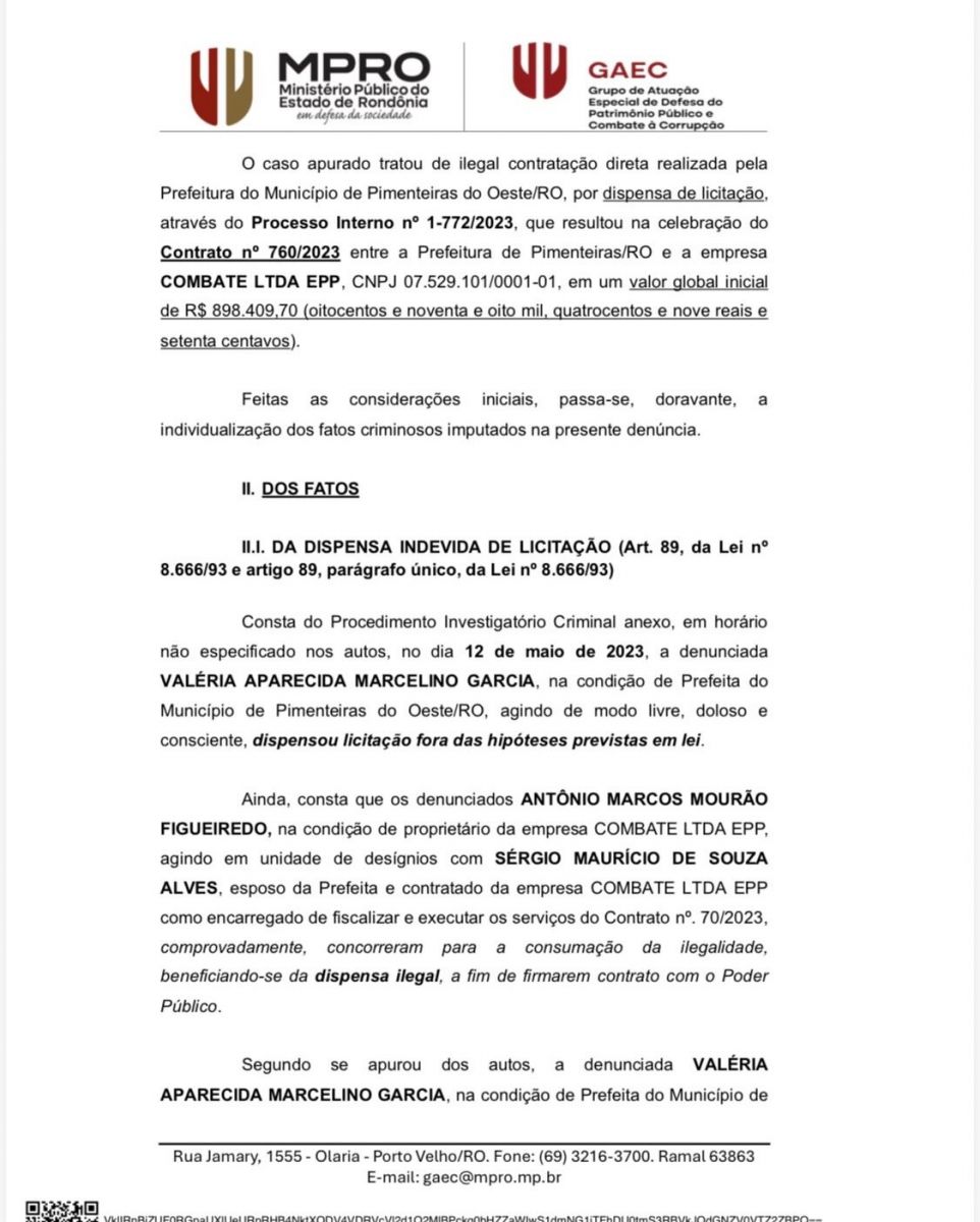 Em manifestação exclusiva ao Rondônia ao Vivo, a Prefeitura de Pimenteiras do Oeste apresentou sua versão sobre a denúncia do Ministério Público de Rondônia (MP-RO) que apura uma suposta fraude em licitação milionária, estimada em R$ 1,1 milhão, envolvendo a prefeita Valéria Aparecida Marcelino Garcia, seu marido Sérgio Maurício de Souza Alves e o vereador de Porto Velho Antônio Marcos Mourão Figueiredo, conhecido como Marcos Combate (AGIR).