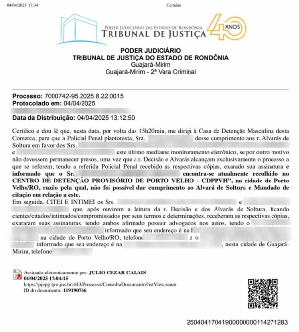 Com base na decisão judicial do início de abril, o oficial de Justiça responsável pela diligência compareceu à Casa de Detenção Masculina da Comarca por volta das 15h20, a fim de cumprir o alvará. No local, a policial penal de plantão, Vívian Salvaterra, informou que Francisco R. B. não estava ali recolhido, mas sim no Centro de Detenção Provisória de Porto Velho (CDPPVH). A divergência impediu o cumprimento imediato da ordem de soltura, que foi formalmente registrada no certificado lavrado às 17h04.