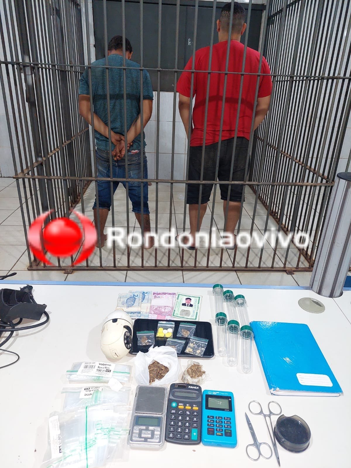 A equipe do sargento PM Machado do 5° Batalhão, auxiliada pelo sargento Pantoja e cabo Castro Aguiar, prendeu na madrugada desta segunda-feira (19) Marcos Vinicius R. A., 18, e Everton R. P. B., 24, por tráfico de drogas em uma residência na Rua José Osmar, bairro Aponiã, em Porto Velho (RO).