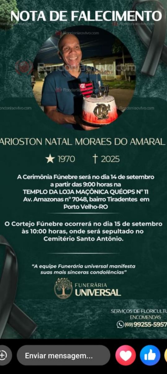 O tenente da reserva remunerada da Polícia Militar Arioston Natal Moraes do Amaral, 54, morreu na noite de sábado (13) em um bar na Rua Terminal dos Milagres, próximo do Centro Político Administrativo (CPA) no bairro Panair, em Porto Velho (RO).