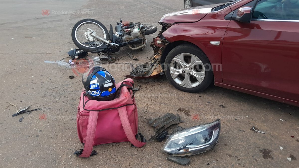 Um motoboy de delivery de 39 anos ficou seriamente ferido após grave colisão com um carro modelo Onix dirigido por uma idosa de 69 anos.