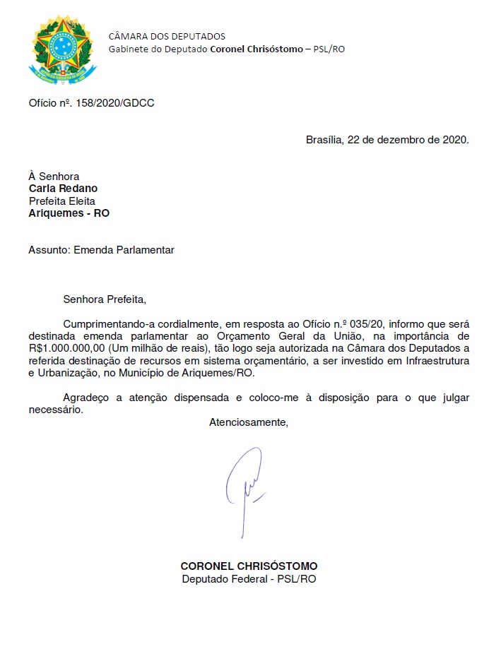O deputado federal Coronel Chrisóstomo (PSL) se comprometeu a enviar a verba para a prefeitura de Ariquemes assim que o sistema orçamentário da Câmara dos Deputados autorizar a destinação de emendas individuais.