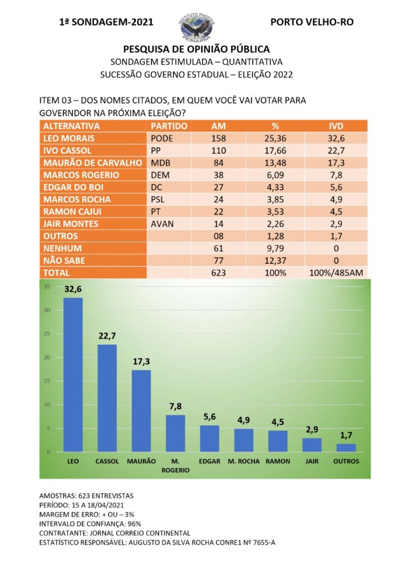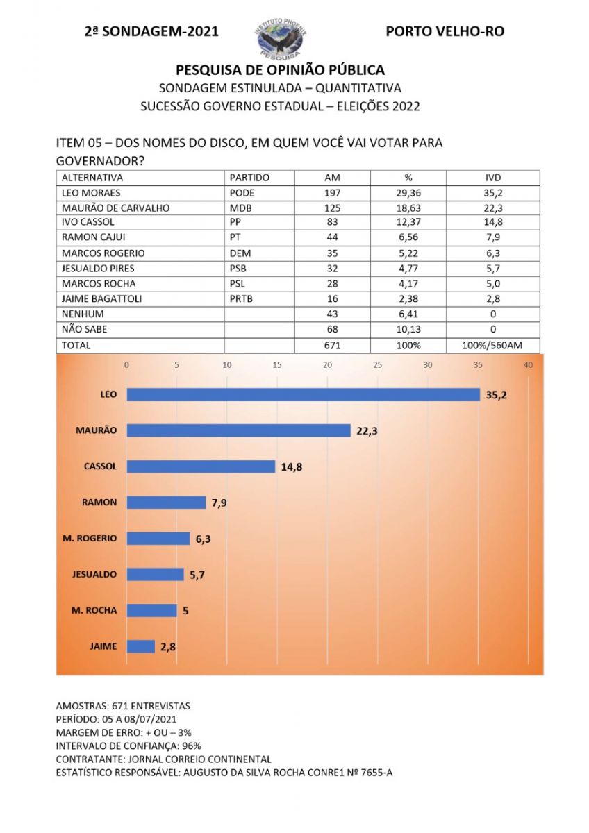 A 2ª. pesquisa estimulada de intenção de votos para o Governo de Rondônia publicada hoje pelo Instituto Phoenix mostra a manutenção da liderança do deputado federal Léo Moraes (PODE) com 35,20%, mantendo o ritmo de crescimento já verificada na sondagem realizada e publicada em abril de 2021.