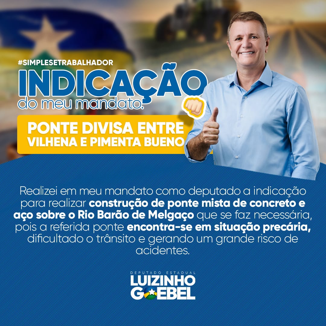 O deputado estadual Luizinho Goebel indicou ao Governo de Rondônia e ao Departamento de Estradas de Rodagem (DER) a construção urgente de uma ponte mista de concreto e aço sobre o Rio Barão de Melgaço, no km 8,5 da Estrada do Capim, trecho que liga a BR-364 ao km 53.