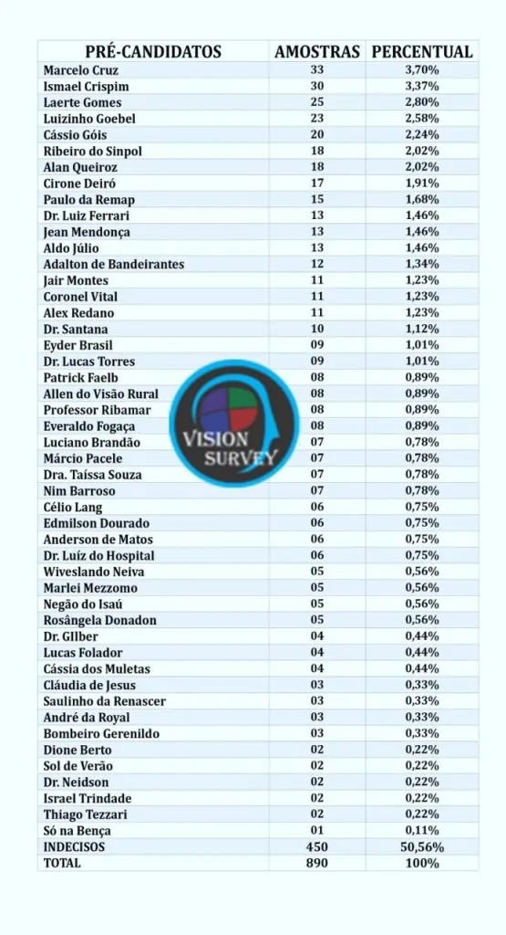 O instituto Vision Survey divulgou hoje a sua primeira pesquisa de intenção de votos para os pretensos pré-candidatos a deputado estadual em Rondônia para 2026. A publicação traz uma lista de mais de 40 nomes, a maioria dela composta por políticos que já detém mandato.