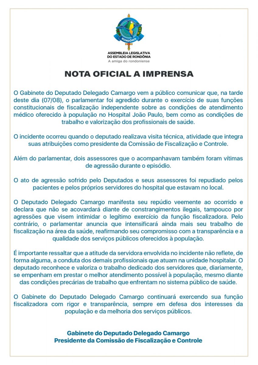 Na tarde de 7 de agosto, o deputado estadual Delegado Camargo foi vítima de agressão enquanto exercia uma de suas principais funções: fiscalizar o atendimento no Hospital João Paulo II, em Porto Velho, em defesa da população.