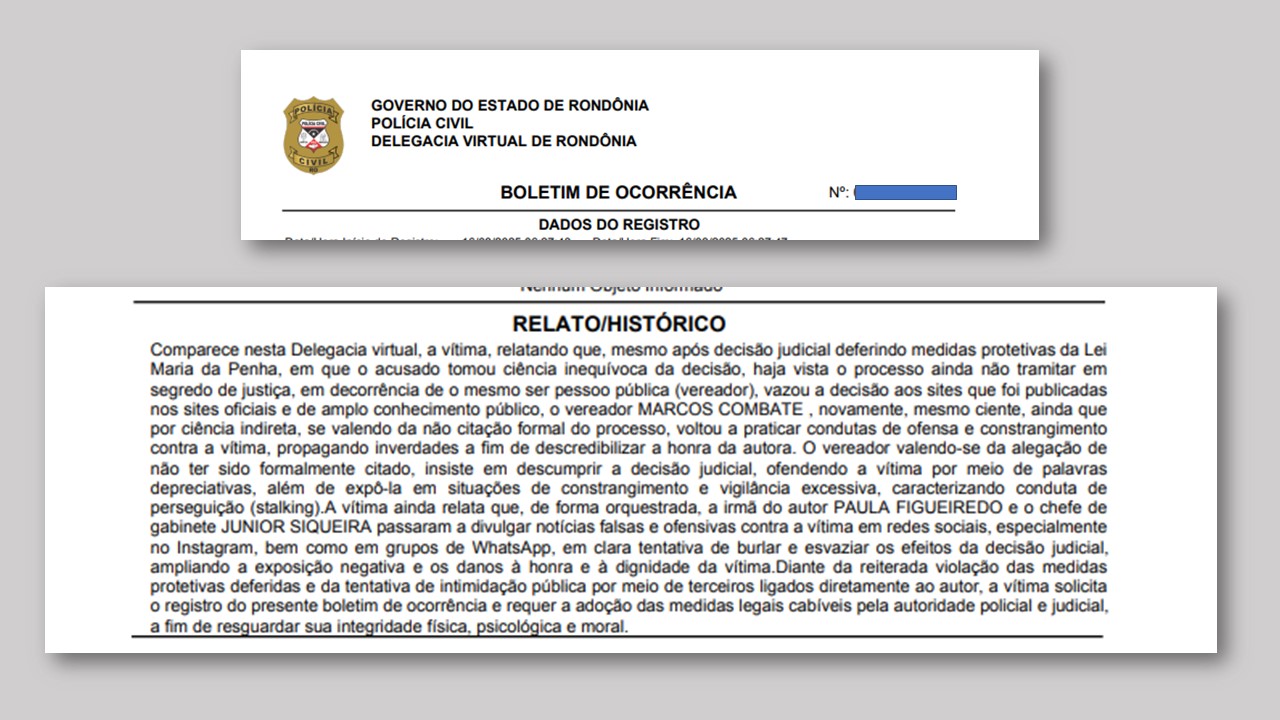 A servidora pública registrou novo Boletim de Ocorrência (N140.478/2025) com base da lei Maria da Penha e outras leis criminais. Diante de constantes descumprimentos de ordem judicial e da tentativa de intimidação pública, a vítima solicitou a imediata adoção das medidas legais cabíveis pela autoridade policial e judicial, para resguardar sua integridade física, psicológica e moral, com recrudescimento da medida protetiva, a suspensão da posse ou restrição do porte de armas do vereador.
