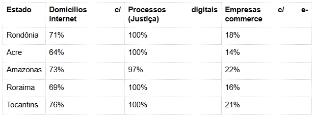 Rondônia posiciona-se na média regional, com destaque para a universalização dos processos judiciais digitais. O e-commerce ainda é menos desenvolvido que no Amazonas, reflexo da menor concentração urbana e logística mais desafiadora.