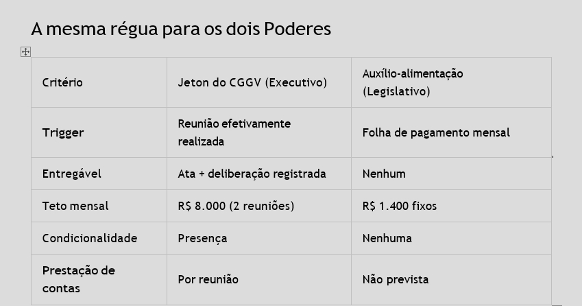 Ou seja: o jeton só é pago se houver reunião, presença e ata. Diferente do auxílio- alimentação dos vereadores, que é pago todo mês, sem reunião, sem entregável e sem prestação de contas individual.