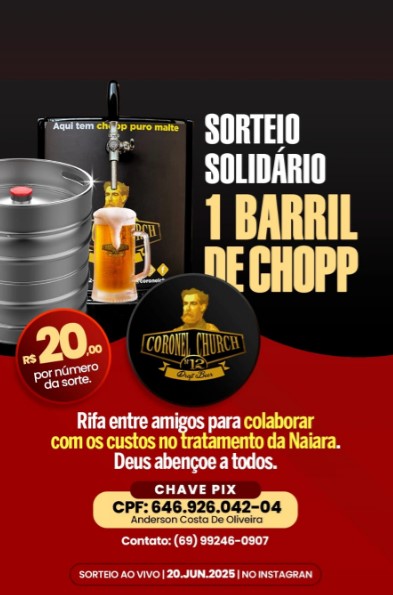 “Estamos passando por uma fase bem ruim e isso vem abalando psicológicamente toda a nossa família, a Naiara vem sofrendo com as possibilidades e as dores que a doença causa em seu corpo, nós que estamos aqui bem perto sabemos o quanto é ruim ter que assistir esse momento, que pode ser superado com menos sofrimento se tivermos condições de acompanhar os medicamentos receitados para o dia-a-dia durante esse período de tratamento. Então resolvi promover essa ação para angariar fundos, estaremos sorteando através de uma RIFA, um barril de 30 litros de Chopp da melhor fabrica instalada em Rondônia. É uma maneira de atrair pessoas que queiram ajudar”, explicou Géri Anderson.