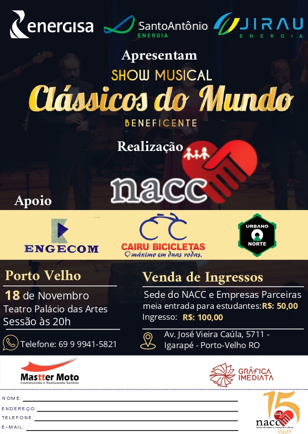 Um espetáculo imperdível! Assim podemos dizer do show “Clássicos do Mundo”, promovido pelo Núcleo de Apoio à Criança com Câncer (NACC). Uma entidade que desenvolve um trabalho muito bonito e solidário de apoio às famílias de crianças que fazem tratamento contra a doença em Porto Velho. O evento acontecerá no Teatro Estadual Palácio das Artes, em Porto Velho, no dia 18 de novembro. Em Cacoal será no Teatro Cacilda Becker, nos dias 26 e 27 de novembro.  Mais informações podem ser obtidas pelo telefone 99941-5821, com Ana Carolina.