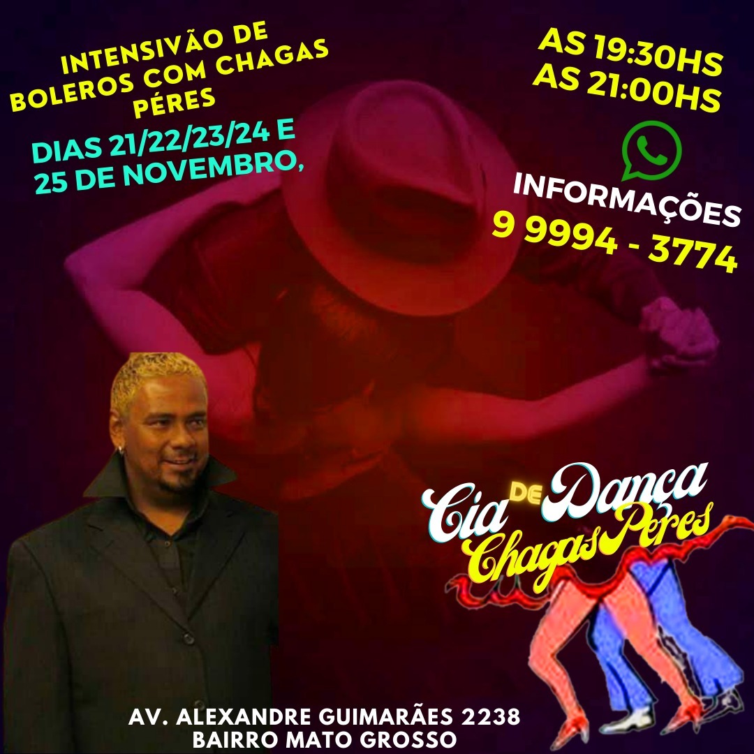 Um intensivão para quem quer aprender a dançar bolero, será dado pelo professor Chagas Peres, nos dias 22,23,24,25 e 25 de novembro, a partir das 19:30. É uma oportunidade única de aprender como dominar esse ritmo romântico de dança, fazer amizades e relaxar. Mais informações podem ser obtidas pelo telefone 9 9994 3774.