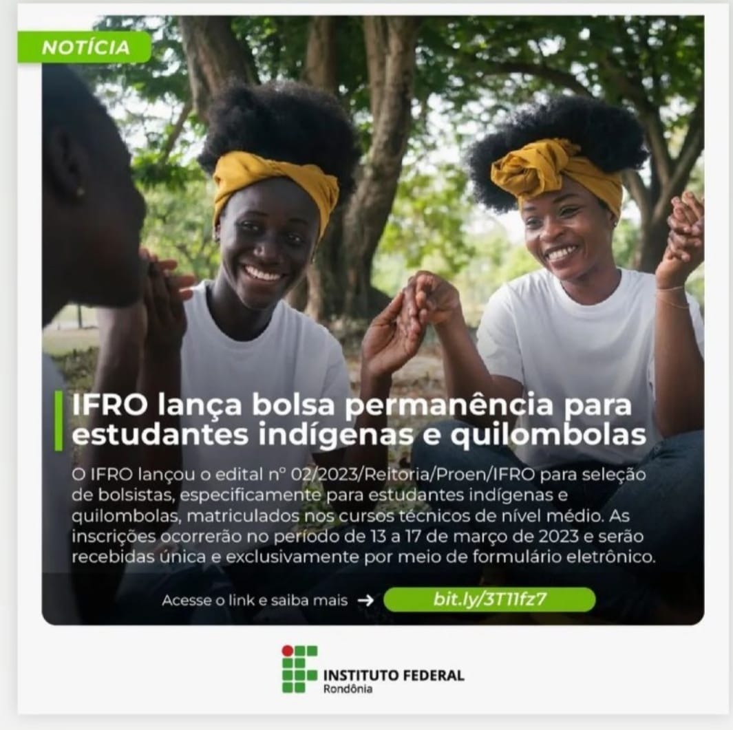 O Instituto Federal de Rondônia está lançando um programa de bolsas de estudos voltado para alunos indígenas e quilombolas dos cursos técnicos de nível médio. As inscrições começaram no último dia 13 de março e terminam na próxima sexta-feira(17). Elas devem ser feitas, exclusivamente, por meio do formulário eletrônico: