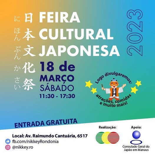 A Feira Cultural Japonesa 2023 acontecerá no próxima dia 18 de março, na sede da Associação Nipo-Brasileira de Rondônia (Nikkey), localizada na avenida Raimundo Cantuária, 6517. O evento volta com força total após quatros anos sem acontecer. O apoio é do Consulado Geral do Japão, em Manaus. Será uma excelente oportunidade para os moradores de Rondônia mergulharem na cultura da Terra do Sol Nascente. Terá comida, exposições, oficinas de desenho mangá, idioma japonês, arranjo floral ikebana, origami e muito mais!