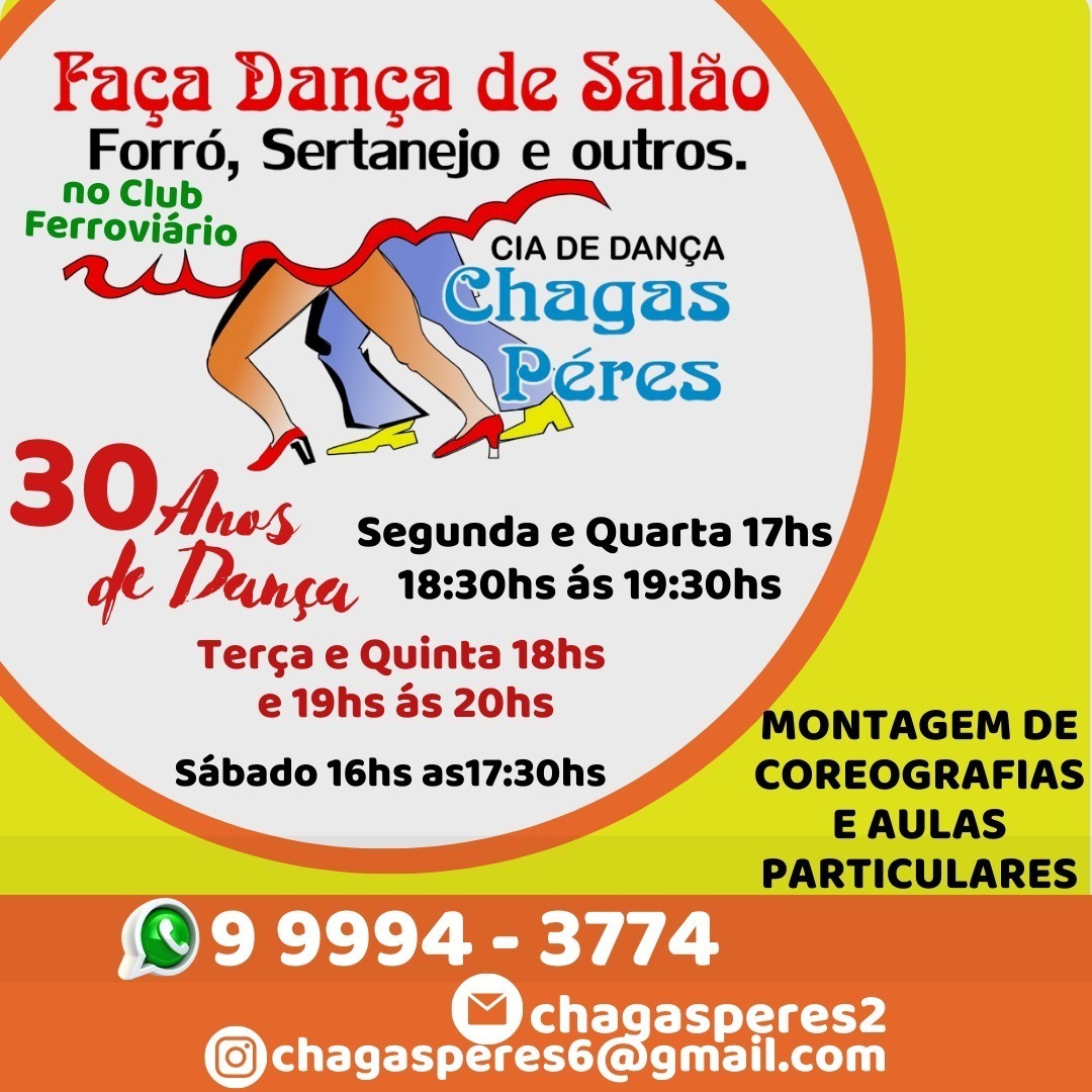 Cansou de passar vergonha por não saber dançar nada? Para que isso não ocorra mais, aprenda a dançar na Academia de Dança Chagas Peres. Aulas de segunda à quinta-feira e aos sábados em diferentes horários, no Clube do Ferroviário, no centro de Porto Velho. Mais informações pelo telefone: 99994–3774 (whatsapp).