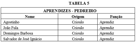 Além dos trabalhos que eram executados por homens experientes conforme carta enviada em 1776, cabia aos aprendizes de pedreiros exercitarem o interesse e a habilidade de aprender um pouco mais sobre o ofício, o que lhe garantiria uma ascensão social. Em toda construção havia sempre a preocupação em escolher um número limitado de aprendizes de pedreiros conforme (Tab. 5) para que não houvesse prejuízo na execução de outras tarefas, em seu total apenas 4 estavam trabalhando.