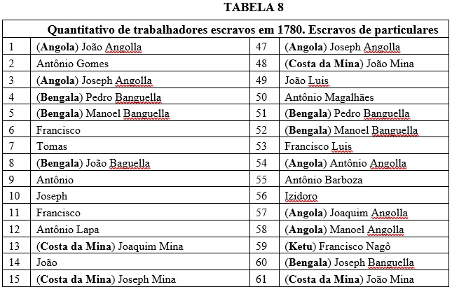 Como podemos observar (Tab. 7) nem todos os trabalhadores relacionados num total de 69 apresentam sobrenome indicando a origem e o local de onde vieram já outros tem o sobrenome de seu dono, os demais deixam uma lacuna quanto a sua origem. Esses escravos eram deslocados das cidades de Belém, Rio de janeiro, Cuiabá e São Paulo para reforçar o contingente de trabalhadores que estavam inseridos na construção do forte.