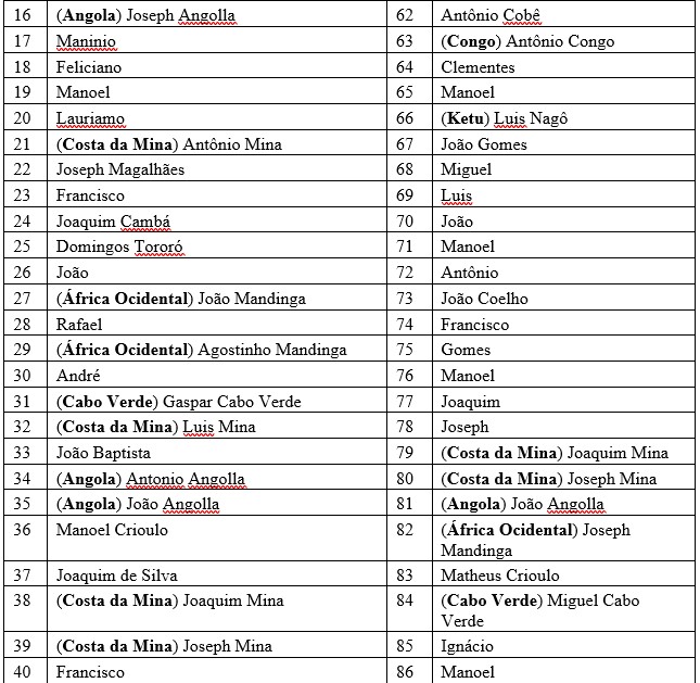 Obs.: Todos esses trabalhadores foram despedidos no dia 28 de outubro de 1776, pertencentes ao senhor Salvador José de Ignácio.