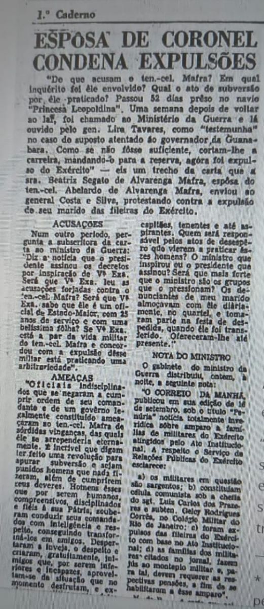 A 11 de setembro de 1964 a senhora Beatriz Segate de Alvarenga Mafra publicou, no jornal “Correio da Manhã” (RJ), uma carta-denúncia pedindo explicações sobre seu marido, ao ministro da Guerra, o general Lira Tavares.