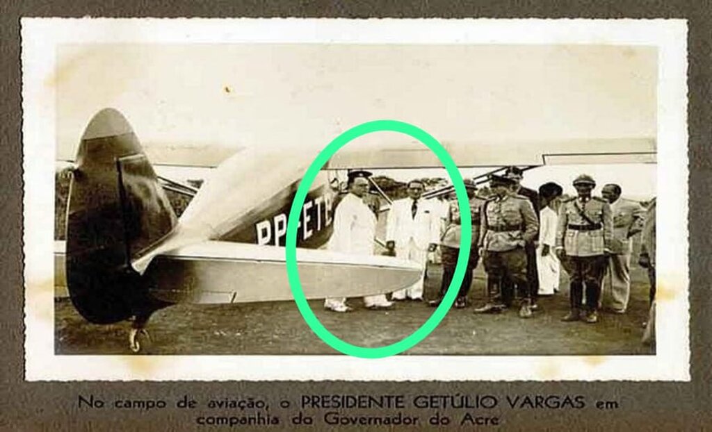 No círculo, Getúlio recebe o governador do Acre (de gravata) no campo de Pouso. (Acervo Esron Menezes.)