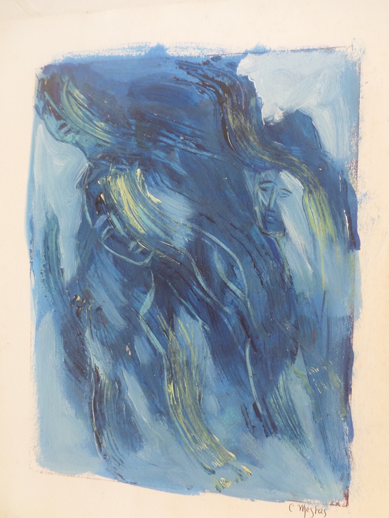 CHRISTIANE MESTAS - A vrai dire, J’utilise deux techniques : la peinture à l’huile sur toile qui donne une expression soutenue de type expressionniste et le monotype à l’huile sur papier plus léger qui s’apparente au type symboliste, mais dans ces deux manières je tente de créer un imaginaire inspiré par la Poésie, à travers des personnages inconnus ou croisés dans une autre vie… pour donner à rêver ou à méditer. La peinture étant le fruit d’une émotion suscite une expression dans laquelle il est bon d’inscrire une touche de spiritualité