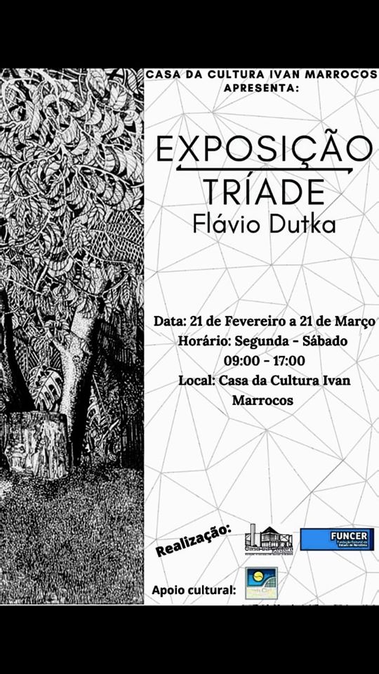A Casa da Cultura Ivan Marrocos, administração PEDRO BRAZ, tem a honra de convidar a comunidade em geral para a Exposição “TRÍADE”, do artista plástico FLÁVIO DUTKA, curadoria do artista FELIPE BANDEIRA.